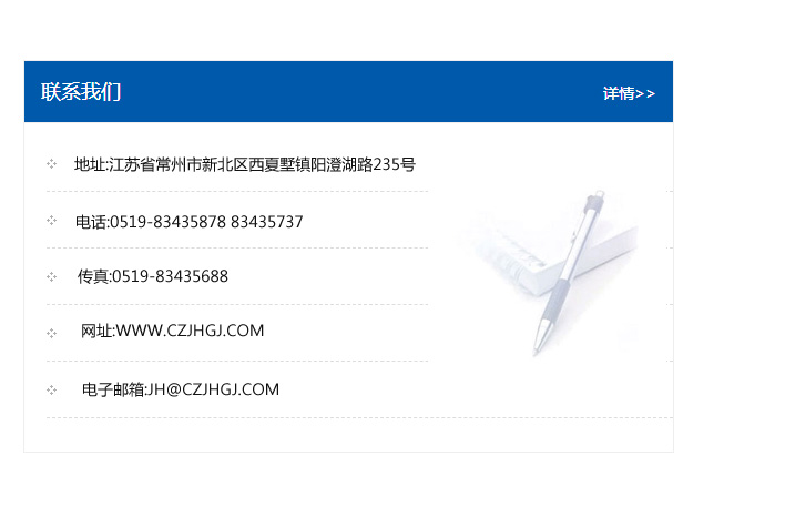 地址:常州市新北區友邦商務大廈1幢16、17層  電話:0519-85101652  傳真:0519-85112595  郵編:213022  網址:www.cz-jiayue_cn.hfyuehuang.com  郵箱:xiajifengaa@163.com